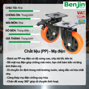 Bánh xe sử dụng chất liệu nhựa Polypropylene (PP) có độ cứng cao, giúp xe vận hành ổn định dưới tải trọng lên đến 120kg/bánh. Chất liệu này có đặc điểm là không bị xẹp hay biến dạng sau thời gian dài đứng yên tại chỗ dưới áp lực tải.