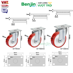 Bánh xe PP cùng loại – đa dạng màu sắc (Trắng, Cam, Đỏ), các phiên bản này có kết cấu, kích thước và tải trọng tương đương, dễ dàng thay thế cho nhau