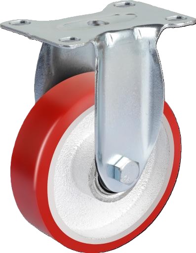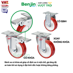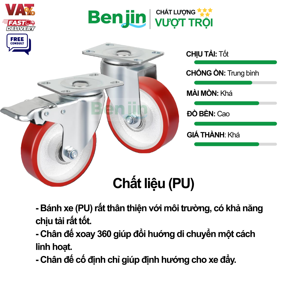 Bánh xe có phần lõi được đúc từ thép đặc, tạo nên bộ khung xương cứng cáp không thể phá hủy dưới áp lực lớn. Lớp vỏ bên ngoài được bọc nhựa Polyurethane (PU) – một chất liệu cực kỳ thân thiện với môi trường nhưng lại có độ bền xé và khả năng chịu tải tương đương kim loại, giúp bánh xe vận hành bền bỉ qua năm tháng.